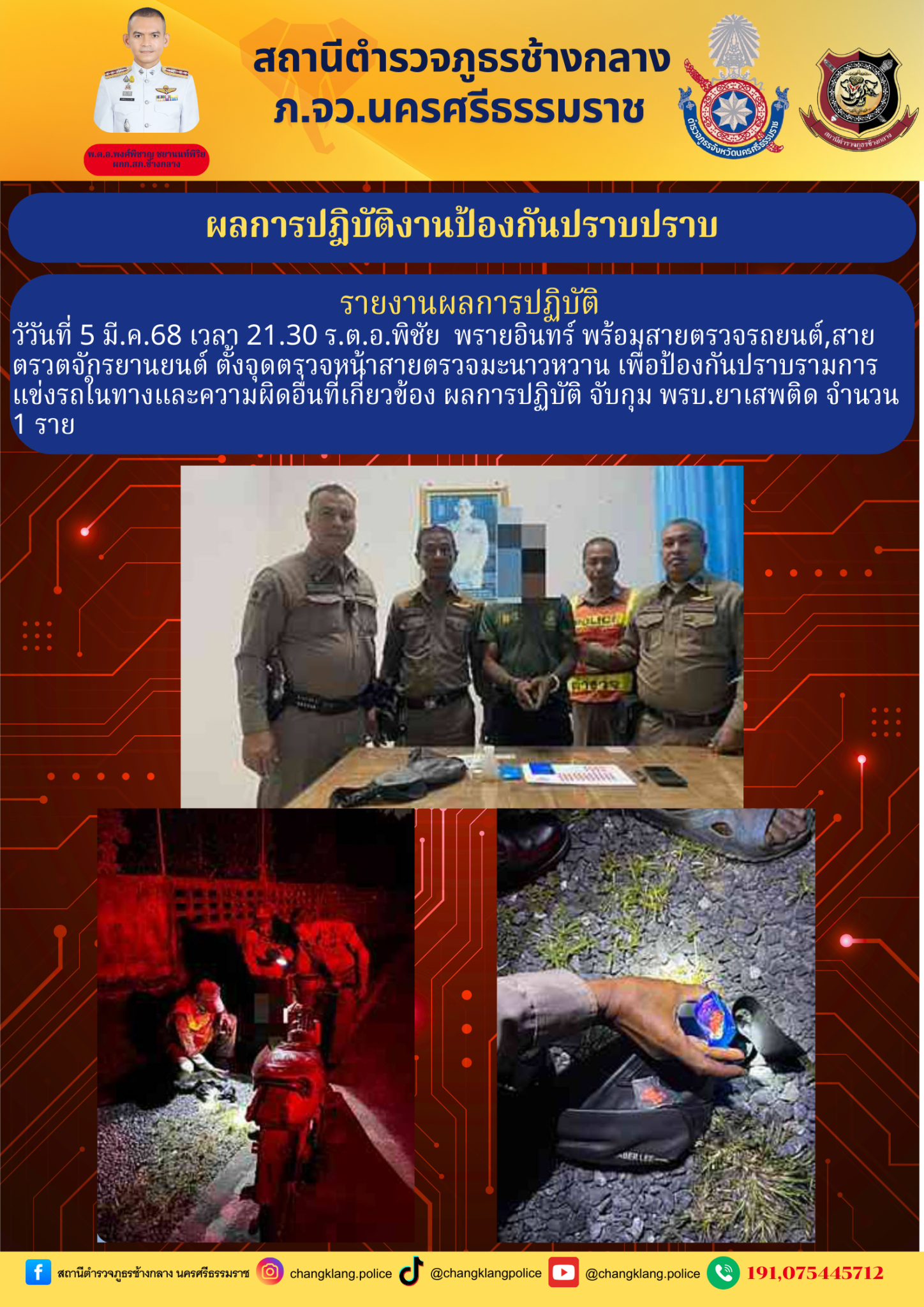 รายงานผลการปฏิบัติ วัวันที่ 5 มี.ค.68 เวลา 21.30 ร.ต.อ.พิชัย พรายอินทร์ พร้อมสายตรวจรถยนต์,สายตรวตจักรยานยนต์ ตั้งจุดตรวจหน้าสายตรวจมะนาวหวาน เพื่อป้องกันปราบรามการแข่งรถในทางและความผิดอื่นที่เกี่ยวข้อง ผลการปฏิบัติ จับกุม พรบ.ยาเสพติด จำนวน 1 ราย