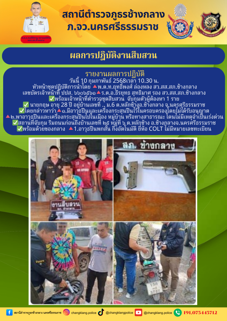 หัวหน้าชุดปฏิบัติการนำโดย 🔺พ.ต.ท.ฤทธิ์พงศ์ ล่องหลง สว.สส.สภ.ช้างกลาง