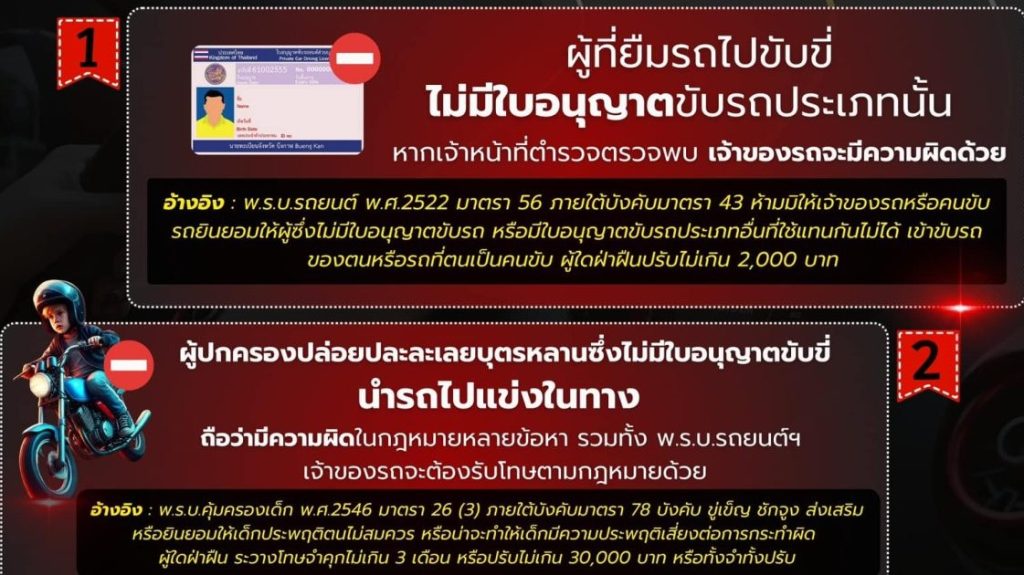 ตัวอย่างจากกรณีเมื่อวันที่ 30 ธันวาคม 2567 เกิดอุบัติเหตุรถจักรยานยนต์ชนกัน 2 คัน มีผู้เสียชีวิต 2 ราย บริเวณถนนหน้าหมู่บ้านแห่งหนึ่ง ต.พิมลราช อ.บางบัวทอง จว.นนทบุรี จากการตรวจสอบทราบว่าหนึ่งในผู้ขับขี่ไม่มีใบอนุญาตขับรถ ได้ยืมรถจักรยานยนต์จากเพื่อนสนิทมาขับขี่ แล้วเป็นเหตุทำให้เกิดอุบัติเหตุ ในทางคดีเจ้าหน้าที่ตำรวจ สภ.บางบัวทอง ได้ดำเนินการติดตามตัวเจ้าของรถจักรยานยนต์ดังกล่าวมาดำเนินคดี ในความผิด พ.ร.บ.รถยนต์ พ.ศ.2522